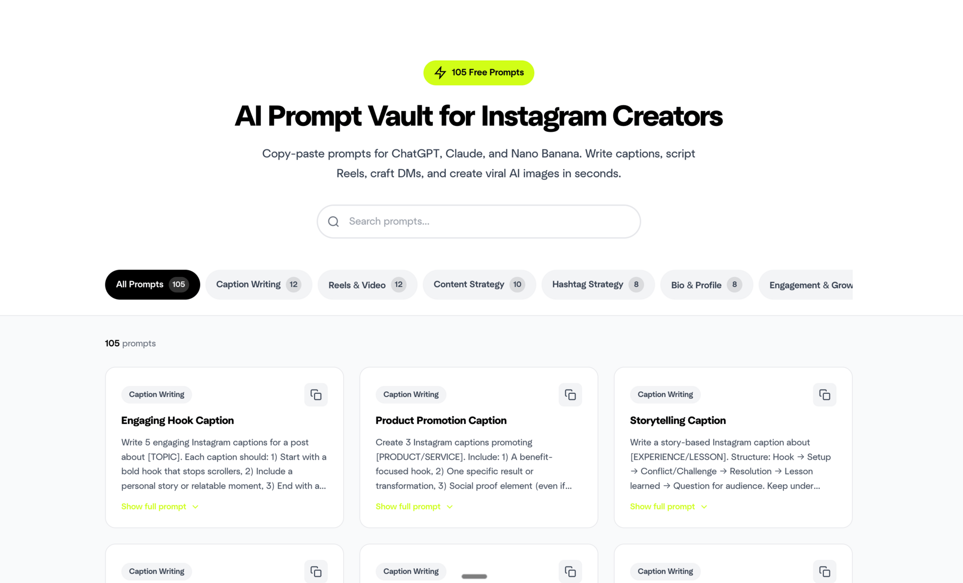 Caption Writing (12 prompts): Hook formulas, storytelling frameworks, call-to-action templates. One prompt generates 5 caption variations from a single content idea.